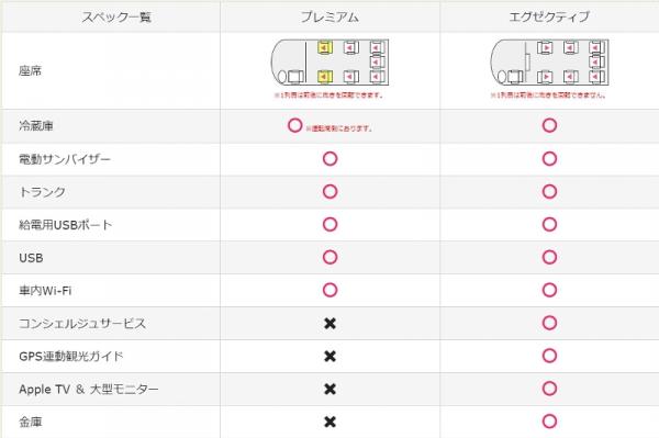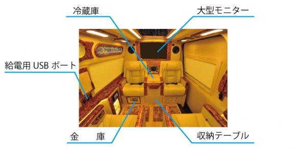 主な車内装備:大型モニター(エグゼクティブのみ)、車内Wi-Fi、冷蔵庫、給電用USBポート