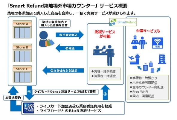 また、ライフカード株式会社と提携し、ライフカードが築地場外市場内店舗の免税手続一括カウンター参加店舗とクレジットカード・銀聯カード加店舗の募集を行い、ライフカード加盟店舗には免税手続一括カウンターの利用手数料を軽減するほか、Smart Refundカウンターと参加店舗間での資金決済にライフカードが提供するB2B決済サービスを採用するなど、協業を進めています。
