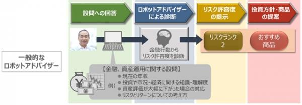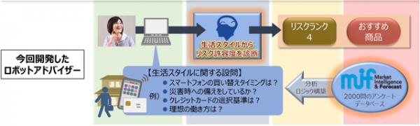 今回開発したロボットアドバイザーでは、金融や資産運用に関する質問は最小限にとどめ、普段の生活スタイルや行動、価値観などを尋ねる形式がメインとなっています。これらの質問に対する回答に基づき、ロボットアドバイザーが生活スタイルの要素も加味したリスク許容度を診断し、それに適した投資方針や商品を提案します。