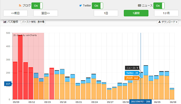 入力されたキーワードのブログ / Twitter / ネットニュースでの出現数や話題急上昇を監視し、出現要因などの解析を日々自動で行います。一旦キーワードをセットすると、システムが監視と解析を続け日々のレポートを作成します。また、話題急上昇(バースト)を検知(小規模・中規模・大規模)しメールで通知します。