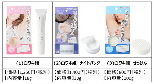 2014年3月に発売したワキの黒ずみを30秒でケアする「白ワキ姫」は、黒ずみの原因になる古い角質をケアする「ピーリング」と、速攻で白く美しいワキに見せる「ホワイトコーティング」の2つの処方にこだわった商品です。従来のワキケア商品は、ムダ毛やニオイに特化したアイテムがほとんどで、”黒ずみ”に着目した商品はありませんでした。黒ずみに特化している事、今までにない「速効ケア」という点が、黒ずみに悩んでいる女性に響き、2015年には昨対と比べて売り上げが6.2倍まで伸長(※2)、販売店舗数も226店舗から7,000店舗(※3)まで拡大しました。更に2016年から同カテゴリー商品が現れ、2017年も続々と増え続けています。その結果、ムダ毛・ニオイに次ぐ、新たな『黒ずみケア』カテゴリーの確立ができ、2015年には国内にとどまらず海外でも販売を開始。順調に売上を伸ばし、2017年には販売個数が前年に比べ3.5倍(※5)伸長。海外でも注目を集め、2017年5月時点で累計販売個数が65万個(※1)を突破しました。