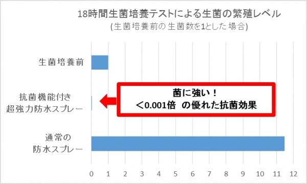通常の防水スプレーと、超強力防水スプレー抗菌機能付きをコーティングした生地で、生菌の培養試験を実施。 通常の防水スプレーをコーティングした生地では培養に伴い、菌が増殖するのに対し、超強力防水スプレー抗菌機能付きでは、菌が減少していくことを確認しています。