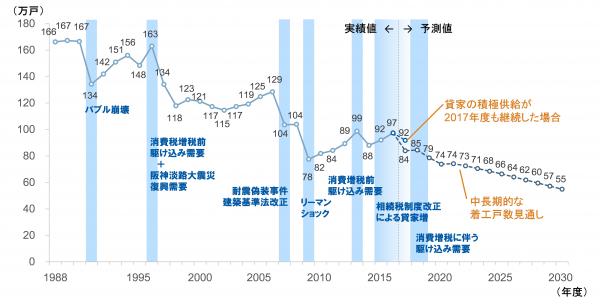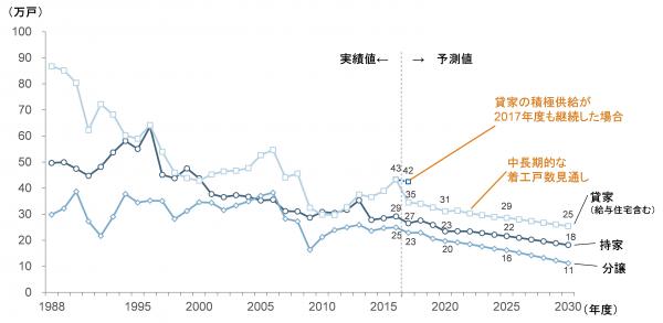 新設住宅着工戸数は、全体で見ると2016年度の97万戸から、2020年度には74万戸、2025年度には66万戸、2030年度には55万戸と減少していく見込みです。利用関係別※2に見ると、2030年度には持家18万戸、分譲11万戸、貸家(給与住宅を含む)25万戸となる見込みです。2017年度について、中長期的な動向に基づく着工戸数は84万戸と見込まれますが、近年見られる相続対策の活発化等に伴って、貸家の積極供給が継続した場合には、92万戸(内、貸家が42万戸)まで増える見通しです(図1、図2)。
