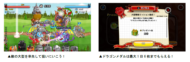 ドラゴンメダルがもらえる「みんなで大型撃破ミッション」を同時開催いたします。敵が大型キャラを