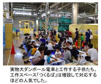 当社ブースでは、独自の展示物「等身大ダンボール製運転台」と手のひらサイズの電車が作れる「ダンボール電車キット」を提供し、イベントを盛り上げました。電車キットは432個の販売がありました。その場で色を塗って工作できるスペース「つくるば」は急遽増設することになり、大人も子どもも電車作りに真剣に取り組みました。日常業務で車両整備にあたっている技術者の社員も、イベントにはじめて参加して、多くの来場者と交流しました。