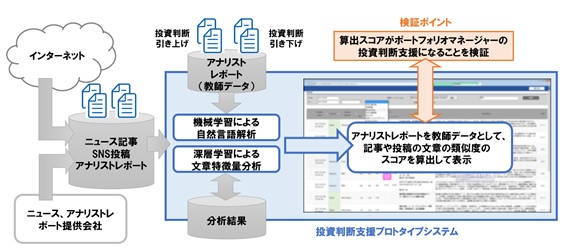 NAMとNRIは、機械学習・深層学習のAI技術を用いてアナリストレポートを含む日本語の各テキスト情報を解析し、当該テキスト情報内に登場する企業に対してポジティブ(業績や企業価値が向上する可能性が高い)な情報であるか、ネガティブ(業績や企業価値が向上しない可能性が高い)な情報であるかをスコア化し、株式運用を行うポートフォリオマネージャーの投資判断の精度向上に資するかを検証しました。