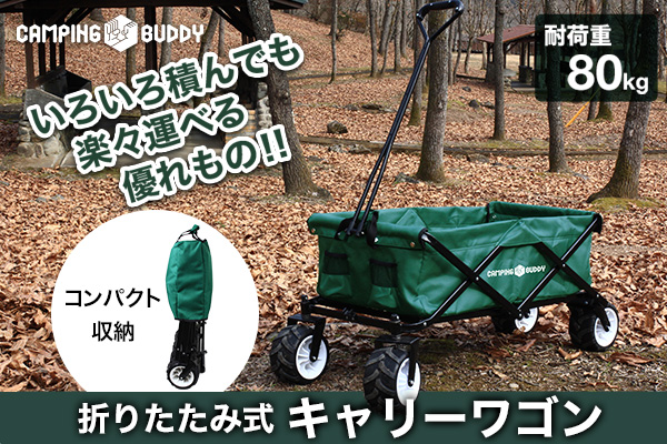 地球家ブランド『CAMPING BUDDY(キャンピングバディー)』のキャリーワゴンは、折りたたみ式でコンパクトに収納可能です。重たい荷物を運ぶ時に、このキャリーワゴンがあれば楽に運ぶことができます。