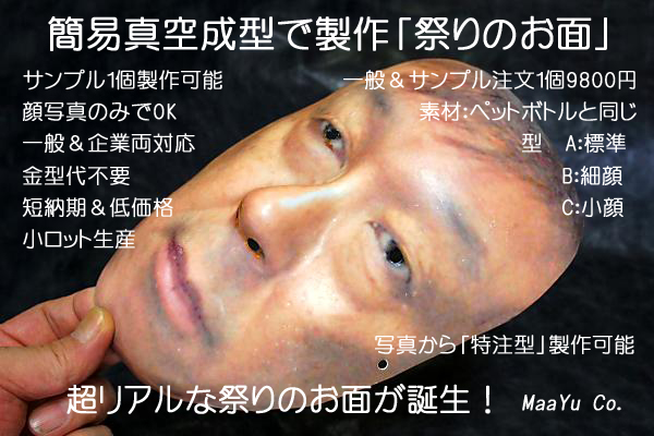 この祭りのお面と同様のプラスティックのお面を1個から製作