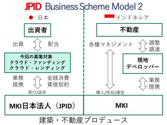 2.一般消費者が出資者となる『クラウド型の不動産投資ファンディング・レンディング』のシステムを活用し、MKIの日本法人がその資金を活用して、MKIと共同してインドネシア事業開発を行うモデル