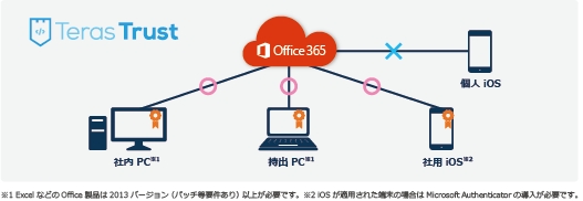 TerasTrust から Windows / Internet Explorer を利用している端末へ証明書を配布する際には、端末への証明書インポート回数を 1 回に制限することができ、期待しない端末へのインストールを抑止します。また、iOS 端末の場合には IMEI / UDID で端末を制限することができるため、Office 365 には自社端末のみアクセスさせるなど、柔軟なアクセス制御を実現できます。