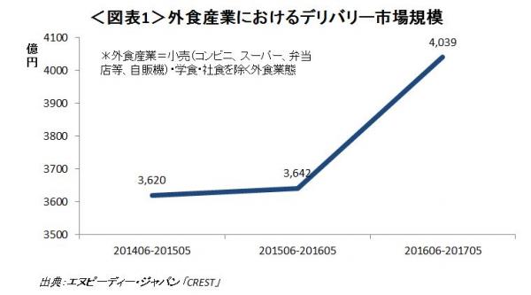 外食産業(コンビニ、スーパー、弁当店などの小売・自販機・学食・社食を除く)の直近1年(2016年6月~2017年5月計)のデリバリー市場規模は4039億円で、前年比で397億円増、+11%とここ一年で急増していることが分かります(図表1)。