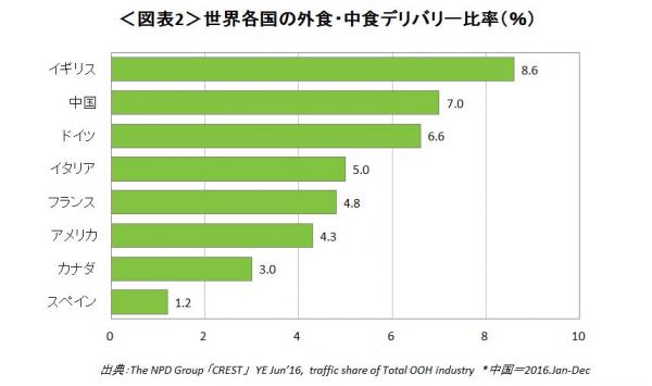 前述の日本の外食産業におけるデリバリーの比率は3.2%です。世界各国のデリバリー比率をみると(図表2)、イギリスの8.6%、中国の7.0%、ドイツの6.6%をはじめ、イタリア(5.0%)、フランス(4.8%)、アメリカ(4.3%)の諸国と比較しても低い比率であることが分かります。