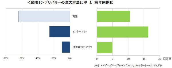 日本においても、デリバリーの急増にはインターネットサイトやアプリの発達が影響を与えています。デリバリーの注文方法の内訳をみてみると(図表3)、電話がまだ6割以上を占めていますが、前年同期比をみるとインターネットが電話を上回る成長を見せており、インターネットとアプリの成長がデリバリー計の増加分の67%を占めています。その結果、直近1年のインターネットとアプリ計の比率は36%と3割を超えています。