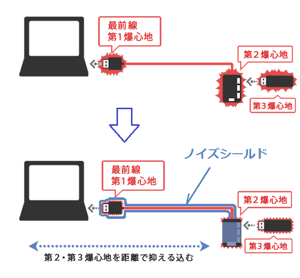 USB3.0/3.1には3つのノイズ源があります。一番妨害電波の影響力の高い順から第1、第2、第3爆心地があります。
