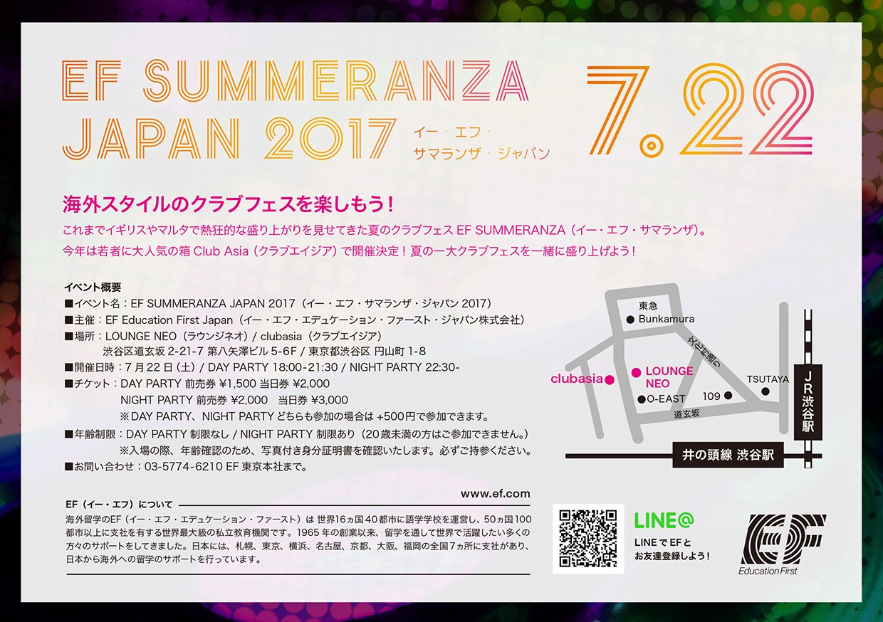 留学・語学教育事業を展開する世界最大級の私立教育機関、イー・エフ・エデュケーション・ファーストの日本法人であるイー・エフ・エデュケーション・ファースト・ジャパン株式会社(東京都渋谷区渋谷 2-15-1 以下EF)は、2017年7月22日(土)に「EF SUMMERANZA JAPAN 2017」を開催致します。