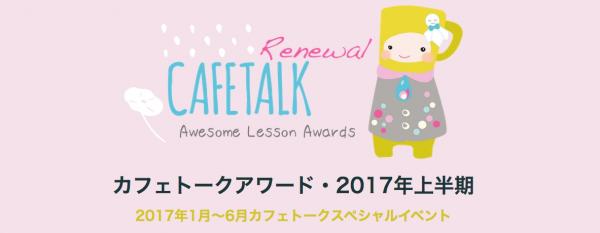 年に2回の前・後期に分け、ユーザーの皆様に最も支持されたオンラインレッスンを決定する「カフェトークアワード」。2017年上半期は新たなルールの元、投票及び選考基準となる生徒様からのご受講レッスンに対する「ご感想」や「口コミ」を沢山お寄せ頂きました。誠にありがとうございました!