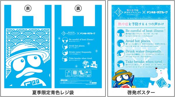 熱中症予防声かけプロジェクト事務局(所在地:東京都渋谷区、事務局長/社会起業家:山下太郎)が総合運営事務局を務める「熱中症予防声かけプロジェクト~ひと涼みしよう~」と、賛同応援企業の株式会社ドンキホーテホールディングス(本社:東京都目黒区、代表取締役社長 兼 CEO:大原孝治)は、「夏季限定青色レジ袋」を、熱中症予防強化月間中の7月10日(月)から全国の店舗で計700万枚を配布し、お客さまへ熱中症予防を呼びかけます。