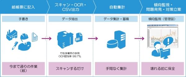 当ソリューションは、設備の点検記録などの紙帳票をスキャンし、富士ゼロックス独自の手書き文字認識技術でデータとして抽出(注4)、そのデータをBIツールを使ってグラフ化することで、設備の状態を可視化します。こうして集められたデータは、前年度のデータや同様設備との比較などの分析を行うことで、異常停止を未然に防ぎ、設備稼働率の向上を実現します。
