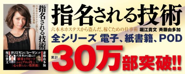 ゴマブックス株式会社(所在地:東京都港区、代表取締役社長:赤井仁)は、2017年7月12日(水)より、堀江貴文氏、斎藤由多加氏の共著『指名される技術』シリーズの累計販売部数(単行本、電子書籍、Amazon プリント・オン・デマンド)が30万部を突破したことを記念し、2017年8月1日(火)までシリーズ全4作品の電子書籍を通常価格より50%オフの特別価格で配信するキャンペーンを実施いたします。