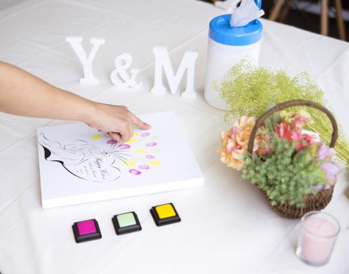 (ウェディングツリーとは、ゲストの方に指でスタンプを押していただき、木やバルーンなどのデザインを完成させる「ゲスト参加型」のウェディング演出アイテムです。)