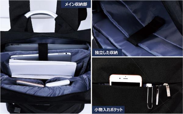 メイン収納部は15.6インチ(A4サイズ)のノートバソコン、資料や雑誌などもすっぽり入るサイズで、仕切りによって独立した収納を可能としました。バック外側の2つのポケットにモバイルバッテリーや化粧品などの小物を入れもあります。