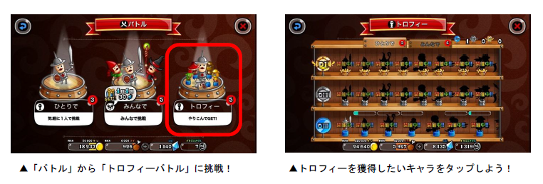 「トロフィーバトル」は、各キャラのトロフィー獲得を目指して、全国のプレイヤーとバトルを行ないます。