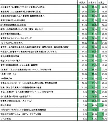 仕事に集中できる割り込み防止、業務量・時期に合わせた柔軟な労働時間の設定、残業削減への評価・残業が削減しても収入が減らない報酬制度等が残業削減に大きな効果を上げると判断できる
