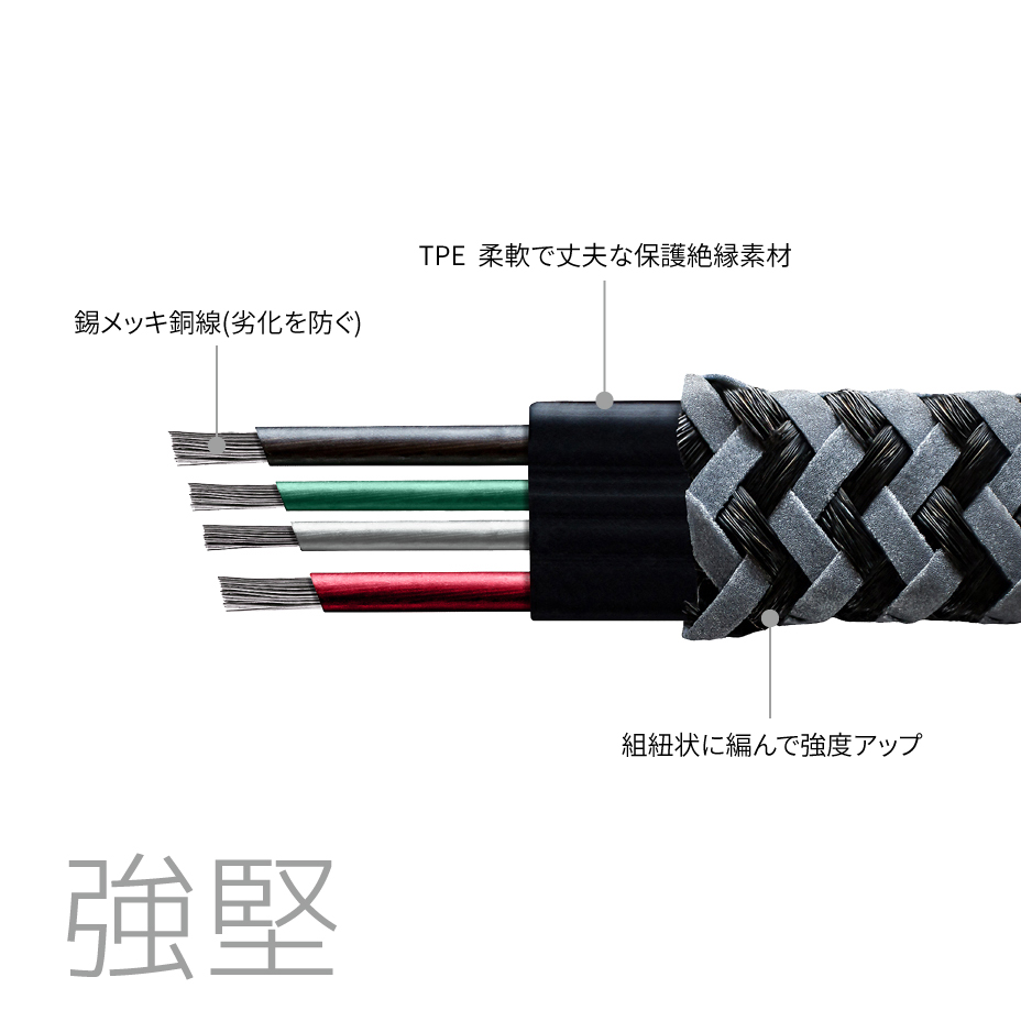ケーブル部分は繊維を編み込んだ組紐状になっており断線しにくい設計です。また各キャラクターのイメージにあわせたカラーを適用しました。さらに、反射材を織り込み、光の当たり方で見え方が変わるようになっています。