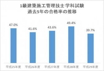「1級建築施工管理技術検定 学科試験」において、総合資格学院では、基準達成現役受講生の合格率88.2%※を達成しました。この合格率は全受験生の合格率39.7%を大きく上回るもので、当学院の提供する講習システムの質の高さを強く裏付けることができました。平成29年度の学科試験では、難易度の高い出題が多くなるなど、単なる過去問の暗記では対策が不十分であり、独学での合格は困難であると云えます。こうした背景から、高度な分析力で学習指導を行う資格スクール利用の優位性が高まっています。