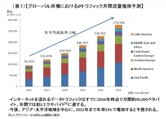 こうした特長は国内企業に留まらず、海外企業においても注目されており、IPトラフィックが急速に増大し、ブロードバンド化を進める世界各地域において今後、急速に需要が高まることが予想されます。(表1参照)