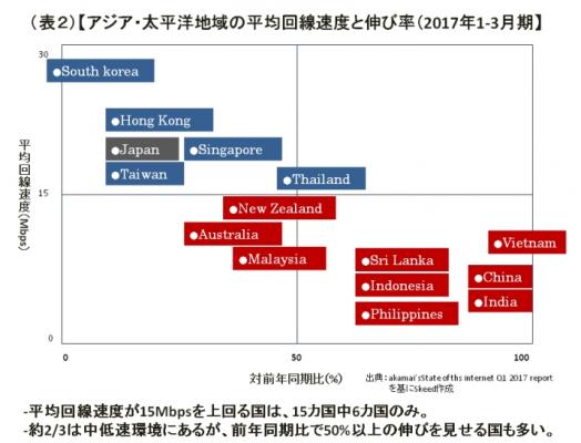 例えば、全世界のIPトラフィックの1/3を占め、今後も大きな成長の見込まれるアジアでは、中国が2017年までの3年間に合計1兆元以上を投資し、大部分の都市部家庭における100Mbpの光ファイバ接続環境、主要都市におけるブロードバンド平均アクセス速度30Mbps超、80%以上の行政村における光ファイバ開通、4Gネットワークの全面普及等の実現に取り組むと発表しています。インドでは「デジタル・インディア計画」を推進し2018年度までの5年間で予算は総額1兆1,300億INRを計画するなど、回線環境の大幅な改善が見込まれます※3。(表2参照)