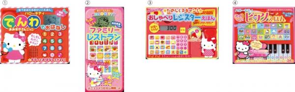 電話やピアノ、レジスターなどの玩具が絵本とセットになっており、ボタンを押すとハローキティの声や、様々な種類のメロディーを楽しむことができます。