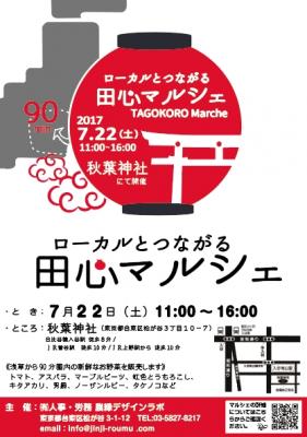 有限会社人事・労務 農縁デザインラボ(東京都台東区、代表:矢萩大輔)は台東区にある秋葉神社にて2017年7月22日(土)に、農と食で地域がつながる「田心マルシェ」を開催した。田心マルシェは、暮らし・はたらき・消費が集まる都市部から90分圏内の身近なローカルで育った新鮮な有機野菜を販売し、農を通じて地域の人と人がつながる場を目指し、毎月台東区で開催している。