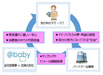 「@baby」では、商品・サービス目線でのマーケティング活動だけでなく、ママ・パパが共感して・信頼して・安心して、ベビーのために商品・サービスを選ぶような消費者目線でのブランディングをANAグループと主婦の友社のリソースを用いながら実施します。