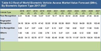 Biometric Vehicle Access Technologies Market 2017-2027:Forecasts & Analysis by Biometric System Type (Iris Recognition, Face Recognition, Fingerprint Recognition, Other (Retina Scan, Hand Geometry, Palm Vein Authentication)), by Vehicle Type (Passenger Cars, Light Commercial Vehicles (LCV), Heavy Commercial Vehicles (HCV)) and by Region plus Profiles of Leading Companies Developing Technologies