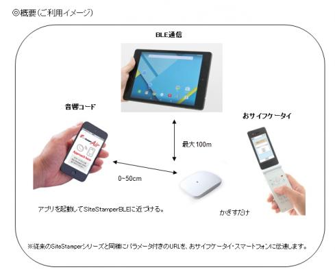 SiteStamperシリーズは、おサイフケータイへはRF通信応答による指令とデータ出力を行い、スマートフォンへは高い周波数帯の音を利用し、音圧出力でスマートフォンの専用アプリに情報を伝達します。