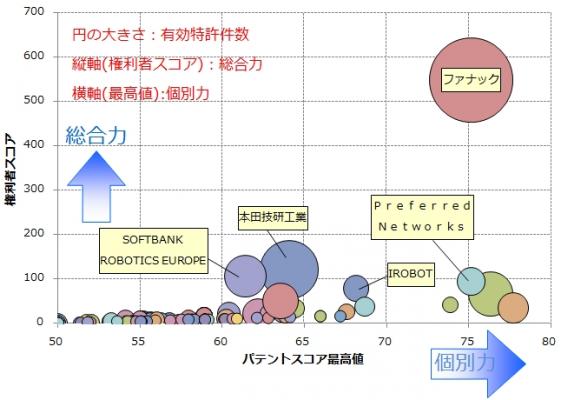 4位以下には、機械学習を活用した産業用ロボット開発でファナックと技術提携を行ったPreferredNetworksや、人間と相互交流するための自律移動ロボット開発も手掛けるIROBOTがランクインしています。