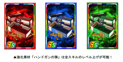 「バイオハザードP」を使い、素材ガチャを回すと限定の強化素材「ハンドガンの弾」を手に入れることができます「ハンドガンの弾」は経験値がアップするだけでなく、全スキルのレベル上昇率がアップします。また、『バイオハザード』コラボ限定カードに対しては強化値2倍の効果があるので、たくさん集めて カードを強化していきましょう!