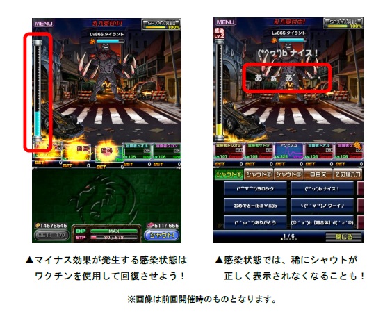 コラボスペシャルダンジョンでは、敵から特定の攻撃を受けると、画面左側にある「t-ウイルスゲージ」が 上昇し、ゲージが最大まで溜まると「感染レベル」が上昇します。感染状態になると、被ダメージが 増加するなど様々なマイナス効果が発生しますが、「バイオハザードP」で交換できる「ワクチン」を 使用することで感染状態から回復します。ワクチンはフレンドに使用することもできますので、感染した フレンドを見つけたら、回復してあげましょう!