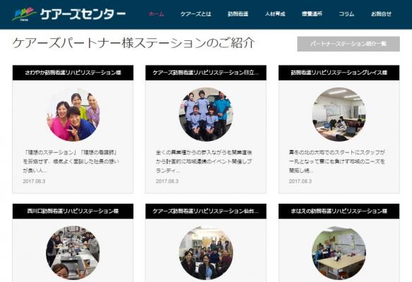新しくなった「ケアーズセンター」では、研修などの情報を最新のものに更新し、デザインをわかりやすく使いやすいものに改めた他、新たに「ケアーズ訪問看護ステーション」とその周辺で展開する、療養通所介護や住宅型有料老人ホームなどの展開についてもコンテンツを整備しています。