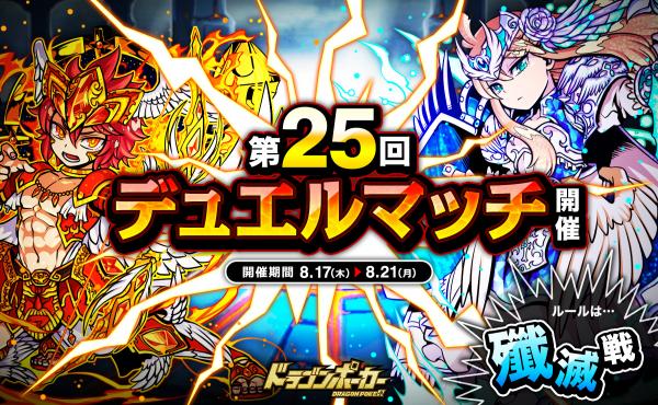 8月17日(木)より、1vs1のリアルタイム対人バトル「第25回デュエルマッチ本戦」を開催いたします。今回のルールは「殲滅戦」です。デュエルマッチでは、バトルで獲得できる「デュエルP」に応じてランキングが決まり、リーグ終了時に報酬が獲得できます。また、累計勝利数に応じて、限定カードも手に入ります。相手の心理を読み、1vs1の真剣勝負に挑みましょう!
