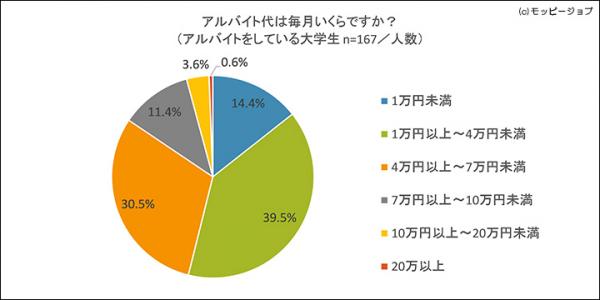 また、大学生アルバイターの毎月のアルバイト代は、「1万円以上~4万円未満」が最多の66人(39.5%)、続いて「4万円以上~7万円未満」が51人(30.5%)という結果になりました(図2)。