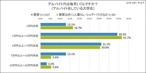 実家暮らしの大学生の毎月のアルバイト代で、最も多かったのは「1万円以上~4万円未満」の48人(39.3%)、次に「4万円以上~7万円未満」38人(31.1%)となり(図6)、実家暮らしの大学生は毎月3~4万円程度、バイトで稼いでいると推測されます。