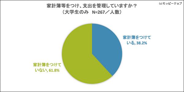 全国の大学生267人に家計簿をつけているかどうかを聞いたところ(図7)、「家計簿をつけている」と答えた人は102人(38.2%)、「家計簿をつけていない」と答えた人は165人(61.8%)でした。3人に1人が家計簿をつけて、支出の管理をしているようです。