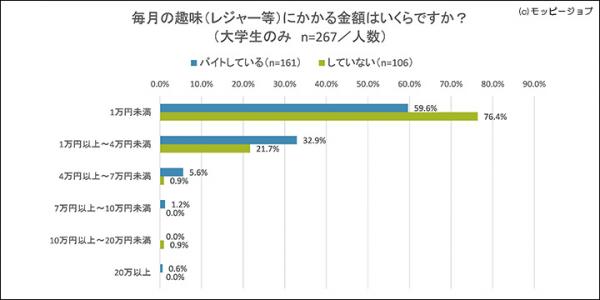 以上の結果から、大学生は洋服、外食、レジャー費のいずれも、選択肢のなかで最低額である「1万円未満」を一番多くの人が選んでいました。バイトをしていてもしなくても、自由に遣えるお金があわせて3万円弱であることがうかがえます。