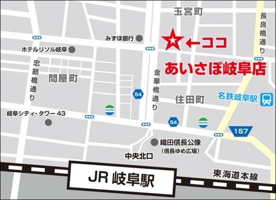 『あいさぽ岐阜店』はJR岐阜駅北口から柳ヶ瀬方面へ徒歩5分、名鉄岐阜駅から西へ徒歩4分の場所にございます。