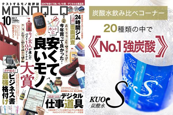 株式会社OTOGINO(オトギノ:代表取締役社長 鬼武公洋 本社 大分県日田市北友田 2 丁目 2123 番地 1)がE-コマースにて販売している主力商品、うまさを感じる強炭酸水「KUOS-クオス-」が、毎月様々な商品を徹底的に検証し、その製品の情報をお届けする月刊誌【MONOQLO(モノクロ)】2017年10月号(2017年8月19日発行:株式会社晋遊舎https://goo.gl/dS3ez3)の『炭酸水全20種類飲み比べ』コーナーにて、1番強い炭酸水に選ばれました。コーナーでは、アクアソムリエによる飲み比べに加え、ガスボリュームの計測を実施。ガスボリュームとは、炭酸ガスを充填する時のガス圧で、数値が高いほど強炭酸と言えます。一般的な強炭酸の多くは数値が4前後ですが、KUOSは20種類の中から唯一ガスボリューム5.3を越えました。