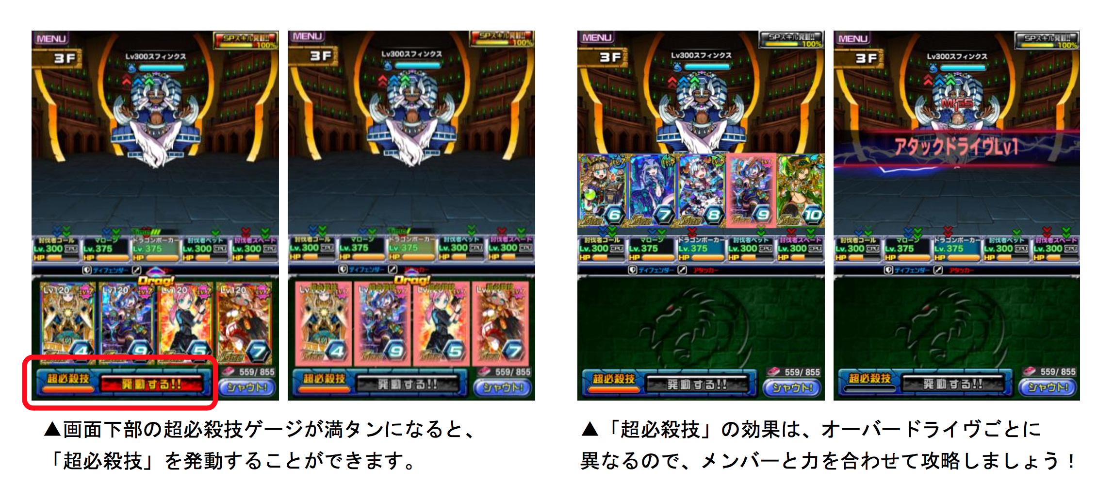 オーバードライヴを装備すると、オーバードライヴごとに異なる「超必殺技」を使用できます。「超必殺技」は、バトル中にダメージを与えたり、ダメージを受けることでゲージが貯まっていき、ゲージが満タンになると発動可能になります。「超必殺技」を効果的な場面で使用し、最上階到達を目指しましょう!