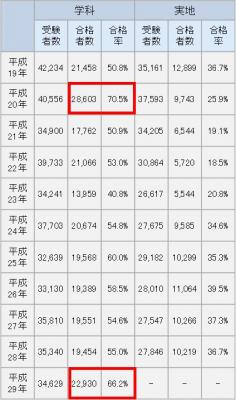 今年の学科試験受験者数は34,629名(平成28年度35,340名 前年比-711名)、合格者数22,930名(平成28年度19,454名 前年比+3476名)、合格率66.2%(平成28年度55.0% 前年比+11.2ポイント)と、合格者・合格率に顕著な上昇傾向が見られました。この高数値は過去10年間で平成20年度(合格者数28,603人、合格率70.5%)に次いで2番目に高い数値となりました。