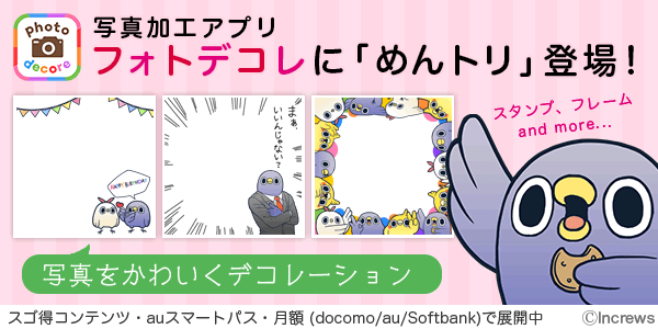 大人気写真加工アプリ「フォトデコレ」で「めんトリ」スタンプとフレームの配信が開始されました!ご自身がスマホで撮影した写真にめんトリ達を自由に貼り付けたり、フレームを利用してより華やかにすることが可能です!「フォトデコレ」は、docomo,au,softbankユーザーの方であれば、月額有料(324円/月)でどなたでもご利用頂けます。また、「スゴ得コンテンツ(R)」、「auスマートパス」に加入されている方なら追加課金なしで今すぐご利用いただけます!是非この機会に撮影された写真をめんトリ色に染めてみてはいかがでしょうか!?